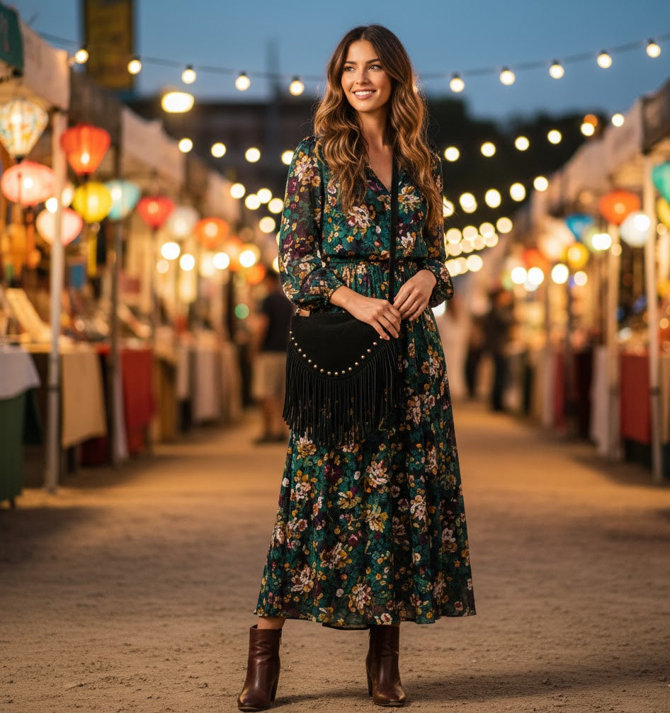 Eleva il tuo stile con questa splendida borsa in Vera Pelle Scamosciata italiana. Perfetta per un look Boho Chic di lusso o Rock Glamour, questa versatile borsa nera è un accessorio di alta qualità che si adatta a ogni occasione, dal giorno alla sera.